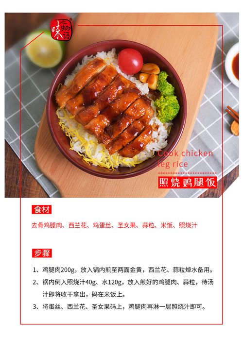 2、鍋內(nèi)倒入照燒汁40g、水120g,放入煎好的雞腿肉、蒜粒,待湯汁即將收干拿出,碼在米飯上。